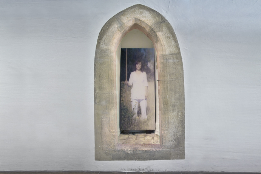 selbstabwicklung II zeigt mich mit einem Stock in der Hand, stehend. Obwohl die Körperhaltung aufgerichtet und wehrhaft ist, sind die Augen geschlossen; der Blick ist nach innen gerichtet. Mit der Serie selbstabwicklung thematisiere ich unterschiedliche Formen der Kontemplation. In dieser zweiten Arbeit geht es um Konzentration, Sammlung und Aufmerksamkeit. (Fotografien Ursula Kreutz) 2008