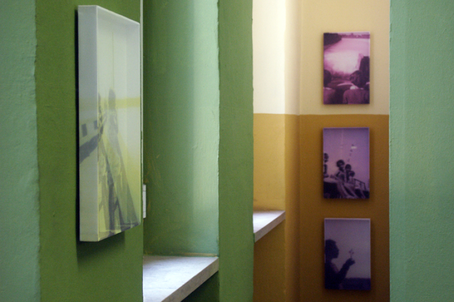 Für die Absolventenausstellung im Straßenbahndepot Muggenhof entwickelte ich bunte kinder: fliederblick, cyanpuste, magentafall, yellowthink, cyanschwan — die ursprünglich schwarz-weißen Fotografien aus der Kindheit meiner Mutter erscheinen in poppigen Farben und in neuem Licht; erstmals lotete ich die technischen Möglichkeiten des Digitaldrucks aus. Die Fokussierung auf bestimmte Details zitiert Vanitas-Symbole und schlägt Brücken zu klassischen mythologischen Motiven. (Fotografien Ursula Kreutz) 2004