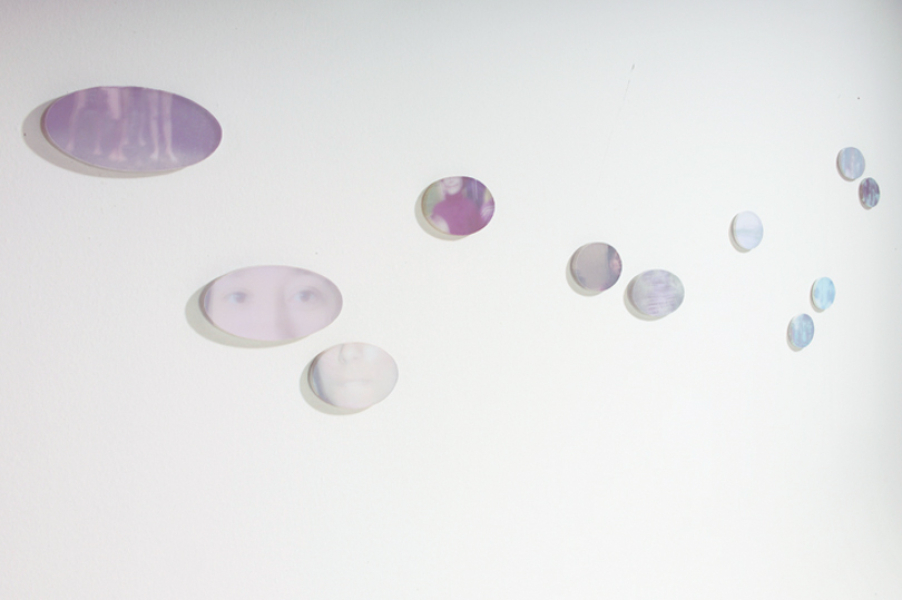 Bildfragmente wabern wie Seifenblasen im Raum, erinnern an Sprech- oder Denkblasen in Comicbüchern: Fotos aus der Kindheit meiner Eltern mischen sich mit Stationen meiner eigenen Geschichte. Es geht hier um das Wesen von Erinnerung, was durch den nebligen, malerischen Charakter der Digitaldrucke unterstrichen wird. Die Bilder sind assoziativ kombiniert und werden immer wieder anders gehängt. Die elliptische Grundform hat eine starke Eigendynamik — wie auch das Erinnern. (Fotografien Chandra Moennsad) 2006