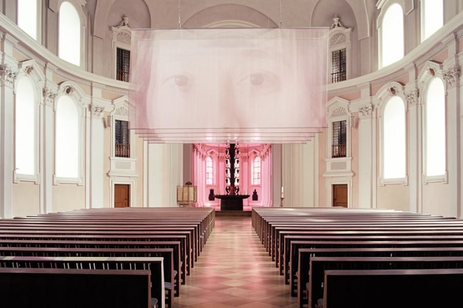 Mit re: blick schuf ich einen konfessionsunabhängigen Meditationraum inmitten der Nürnberger Kirche St. Egidien. Gewaltige Textilsegel schweben in transparenter Leichtigkeit, der unschuldig wirkende Blick einer jungen Frau zitiert Gemälde der Renaissance. Ein Torso ist mit tausenden Seidenblüten gespickt. Auch die Fenster des Westschiffs sind mit fünfblättrigen Seidenblüten beklebt, was den gesamten Raum in magentafarbenes Licht taucht. Als moderne Kreuzweg-Interpretation kreist re: blick um Schönheit, Verletzung, Schmerz und Erlösung. (Fotografien Bruno Weiss) 2007
